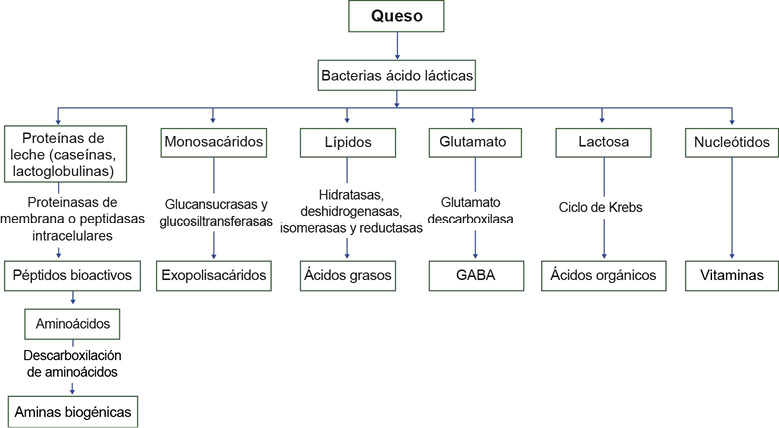 Las bacterias ácido lácticas participan en la fermentación de productos lácteos, estas interactúan con los componentes de los alimentos y cambian las propiedades de estos a través de reacciones bioquímicas complejas (Bulat & Topcu, 2020). En las matrices de quesos es posible encontrar alta diversidad de BAL, las cuales, entre otras funciones, desarrollan las características sensoriales del queso y son incorporadas como parte de un cultivo iniciador o de un cultivo secundario no iniciador (Santiago-López et al., 2018). La principal función de las BAL está orientada hacia la producción de ácidos orgánicos vía metabolismo de los carbohidratos, pero poseen muchas más enzimas para producir otros compuestos bioactivos (Figura 1).