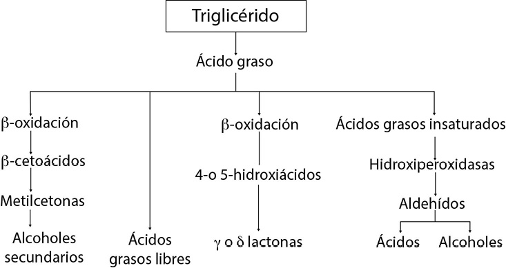 La grasa de la leche puede modificarse por hidrólisis u oxidación. Sin embargo, la oxidación está limitada, debido al bajo potencial redox de los quesos. Durante la degradación de los triglicéridos se liberan concentraciones altas de ácidos grasos de cadena corta e intermedia. Los ácidos grasos de cadena corta tienen impacto en el sabor, sin embargo, la alta actividad lipolítica es indeseable en la mayoría de los quesos, pues puede derivar en el desarrollo de rancidez por la presencia de ácidos grasos libres (AGL). La oxidación y descarboxilación producen metilcetonas y alcoholes secundarios, mientras que la esterificación de hidróxilos y ácidos grasos producen lactonas (Figura 2). Los ácidos grasos reaccionan con grupos alcohol para formar ésteres como el butanoato de etilo (Santiago-López et al., 2018).