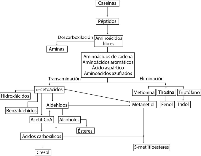 De entre los procesos bioquímicos o microbianos que pueden modificar los quesos está el metabolismo de bacterias ácido lácticas (BAL), levaduras u hongos presentes en la leche o adheridas en el proceso de elaboración o maduración. Estas toman nutrientes originales de la leche y los catalizan por medio de reacciones enzimáticas diversas (Santiago-López et al., 2018). La degradación de ácidos, grasas y proteínas son las reacciones enzimáticas más notorias que ocurren a los quesos a través de procesos de oxidación, descarboxilación, transaminación, esterificación, deshidrogenación, reducción y otros (Johnson, 2017).
