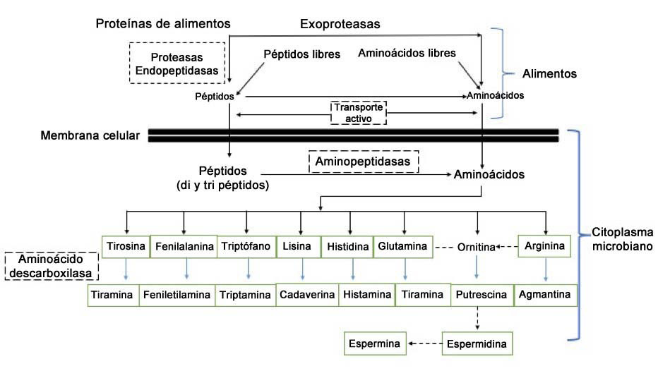 Durante la maduración de queso de leche de oveja cruda, el conteo de bacterias del género Enterocococci fue proporcional a los contenidos de prutrescina, cadaverina, tiramina y dopamina (Saidi, Sheikh-Zeinoddin, Kobarfard, Soleimanian-Zad & Sedaghat Doost, 2020). Lactobacillus es un género capaz de sobrevivir a condiciones severas, debido a su capacidad de utilizar carbohidratos poco fermentables y descarboxilar aminoácidos con la consecuente producción de aminas biogénicas (Møller et al., 2020).