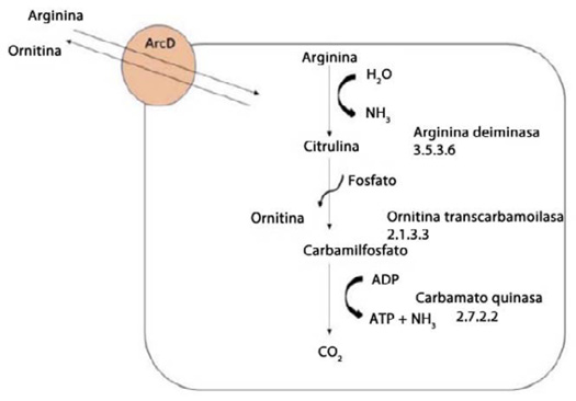 Para degradar arginina a ornitina, amoníaco y dióxido de carbono, tres enzimas son necesarias; arginina deaminasa que convierte la arginina a citrulina y amoníaco, la citrulina es después metabolizada por la ornitina transcarbamilasa a ornitina y carbamoil fosfato, el fosfato es reubicado de carbamoil fosfato a adenosín difosfato (ADP), mediante la carbamato quinasa que forma adenosín trifosfato (ATP) y el carbamato se descompone en amoníaco y dióxido de carbono (Figura 5). Otro elemento importante en la ruta ADI es un antiportador que transloca ornitina y arginina a través de la membrana celular (Wenzel et al., 2018).