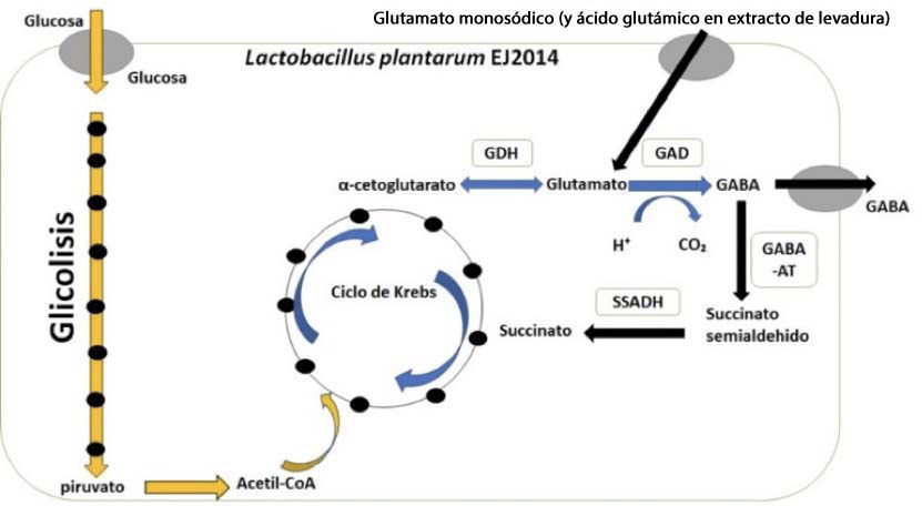 Cuando el glutamato se convierte en GABA mediante descarboxilación por la enzima ácido glutámico descarboxilasa (GAD), la liberación de dióxido de carbono coincide con el consumo de hidrógeno, lo que resulta en un aumento del pH en el medio. Un medio sintético típico para promover la producción de GABA contiene 100 g L-1 de extracto de levadura, 10 g L-1 de glucosa y 22,5 g L-1 de glutamato monosódico. En estas condiciones se ha reportado que algunas cepas de L. plantarum presentan el rendimiento más alto (19,8 g L-1) de GABA en comparación con otras cepas de L. plantarum (Jeon Park et al., 2021).