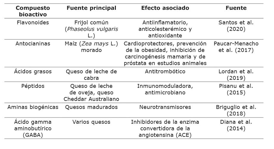 La leche y los productos lácteos proporcionan una amplia gama de componentes bioactivos (Majid, 2016). Entre los productos lácteos, el queso se posiciona como una rica fuente de componentes con importantes beneficios para la salud. El calcio tiene un efecto positivo para prevenir padecimientos como la osteoporosis y la caries dental. Del mismo modo, el ácido linoleico conjugado (CLA) ha demostrado tener efectos anticancerígenos y propiedades antiaterogénicas (López-Expósito et al., 2017). Otros compuestos bioactivos incluyen vitaminas, péptidos bioactivos, aminas biogénicas, ácido gamma-aminobutírico.