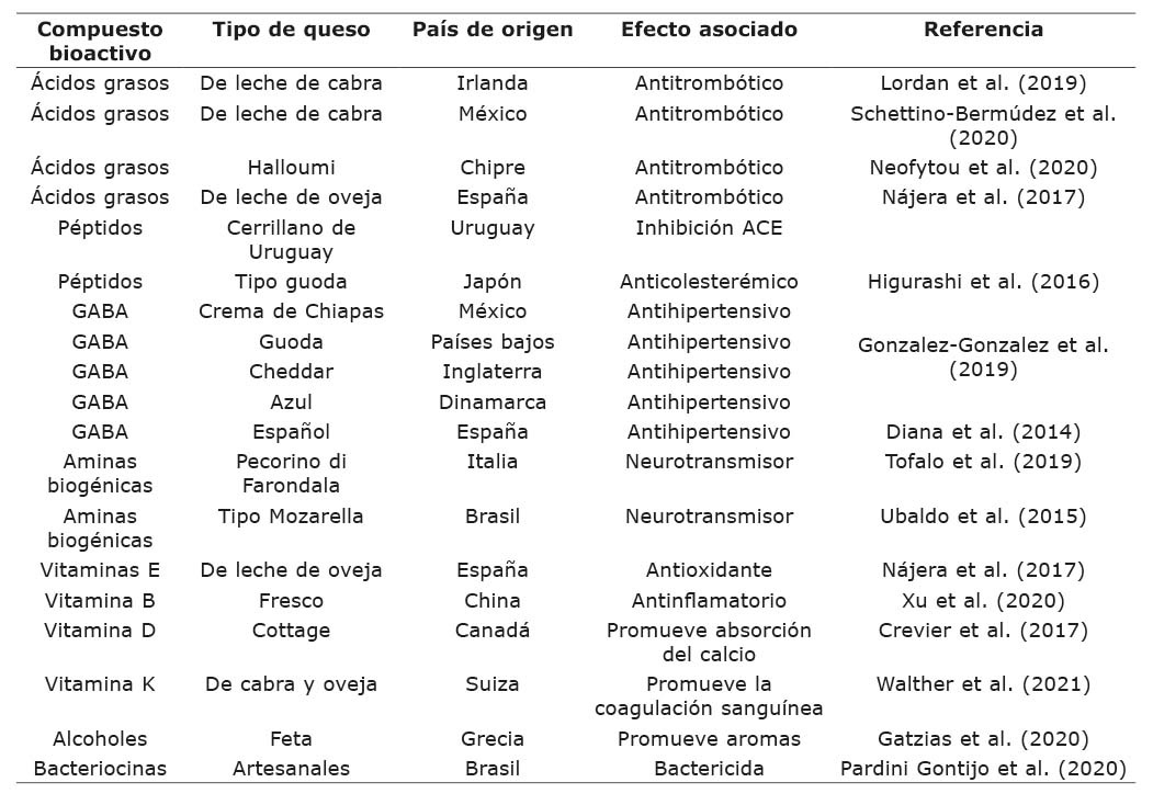 Además de los componentes nutrimentales básicos, los quesos tienen una fuente importante de compuestos bioactivos. Algunas de estas sustancias se producen durante el procesamiento de la leche, pero la gran mayoría de estas son producidas por bacterias acido lácticas (BAL) durante la elaboración y/o maduración (Bulat & Topcu, 2020). De entre los compuestos bioactivos más comunes se encuentran: exopolisacáridos, péptidos, ácidos grasos, aminas biogénicas, ácidos orgánicos, vitaminas, bacteriocinas, acido gama-aminobutírico, etc. (Şanlier et al., 2019; Santiago-López et al., 2018). Estas sustancias ayudan a reducir la presión sanguínea, combatir infecciones estomacales y el aumento de peso, prevenir la osteoporosis, etc. (Park & Nam, 2015). De los compuestos bioactivos con mayor importancia en lácteos y derivados, se citan algunos reportes presentados en quesos de distintas partes del mundo.