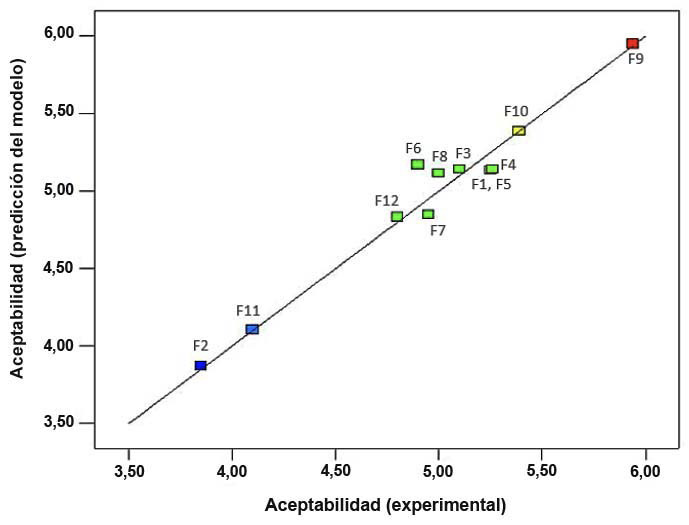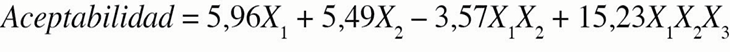 Los resultados del análisis de varianza para la variable de respuesta aceptabilidad y el procesamiento estadístico del modelo especial cúbico seleccionado arrojaron la ecuación 1.