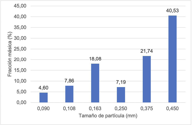 El mayor porcentaje de fracción másica (40,53 %) quedó retenido en el tamiz inicial, valor alejado a las intenciones experimentales de este trabajo.