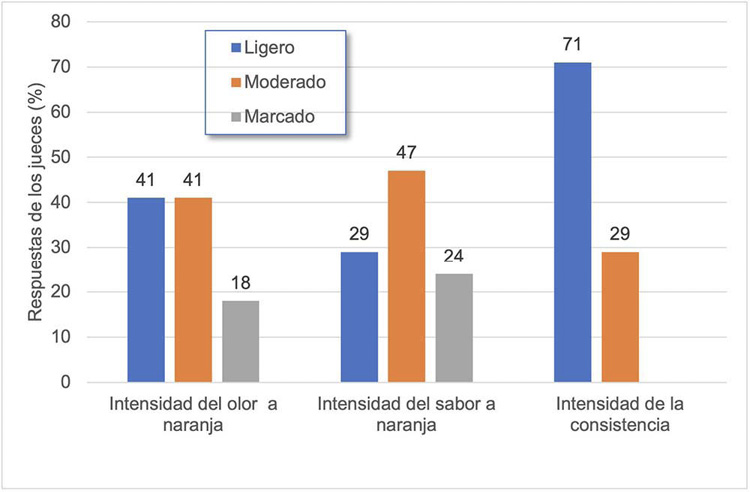 Una vez seleccionada la mejor formulación, el panel de jueces evaluó la intensidad de los atributos olor y sabor a naranja, así como de la consistencia, mediante los atributos “ligero”, “moderado” y “marcado”.