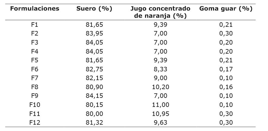 Se aplicó un diseño de mezcla con el empleo del programa Design–expert Versión 8.0. Se definieron como variables independientes: suero (79,95 a 84,15 %), jugo concentrado de naranja (7 a 11 %) y estabilizante goma guar (de 0,1 a 0,3 %) (Cuadro 1). Se definieron como variables fijas: 5 % de azúcar refino y 3,75 % de harina de arroz gelatinizada (Colominas-Aspuro et al., 2019). Las variables de respuesta definidas fueron: aceptabilidad y estabilidad. Además, se determinó la acidez total valorable expresada como ácido cítrico a cada una de las formulaciones (ONNC, 2006).