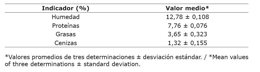 Con referencia a la composición proximal de la harina de arroz, los resultados que aparecen en el Cuadro 3, muestran valores de proteínas, grasas y cenizas característicos de la variedad Perla de Cuba.