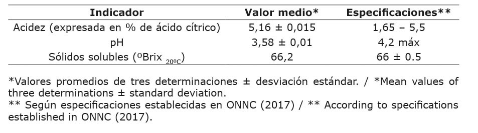 La caracterización general del jugo concentrado de naranja se muestra en el Cuadro 4, el cual cumplió con los parámetros de calidad. La acidez no excedió el 5,5 %, el pH fue inferior a 4,2, mientras que los sólidos solubles estuvieron dentro de los valores establecidos en las especificaciones de calidad (ONNC, 2017).