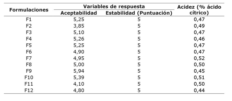 Con referencia a la estabilidad, se destaca en todas las formulaciones una uniformidad total con ausencia de sedimento, lo que demostró que las dosis de goma guar entre 0,1 % y 0,3 % empleadas lograron mantener los sólidos en suspensión. La acidez evidenció valores que oscilaron entre 0,44 % y 0,52 %.