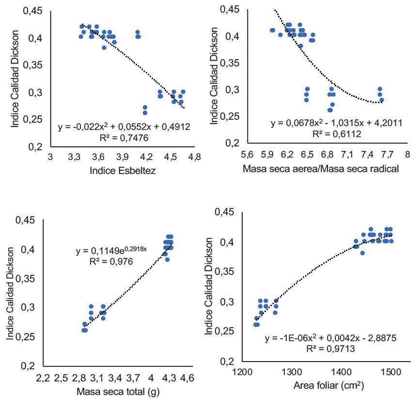 Figure 1. Relationship between the Dickson Quality Index with the Slenderness Index, total dry mass (g), leaf area (cm2), and shoot dry mass / root dry mass ratio in cocoa (Theobroma cacao) seedlings in the nursery of the Paso de Cuba Management Center, Baracoa, Cuba. 2018–2019.