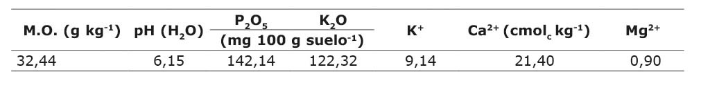 El pH-H2O se determinó en una relación suelo: solución (1:2,5) por el método potenciométrico. La determinación de la materia orgánica por el método de Walkley-Black (oxidación del C con K2Cr2O7 0,50 M en H2SO4 (18 M al 98 %) y valoración con SO4FeNH4 (0,25 M). La determinación del P2O5 y el K2O se hizo por el método de Machiguín (solución extractiva de (NH4)2CO3 con concentración de 10 g L-1, pH 9,0) y valoración con ácido ascórbico. Los cationes intercambiables se obtuvieron por extracción 1/5 con NH4Ac 1 M pH 7 y determinación por complejometría (Ca y Mg) y fotometría de llama (K).