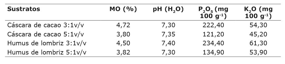 Los sustratos para el llenado de las bolsas (suelo: cáscara de cacao descompuesta, suelo / humus de lombriz en proporciones 3:1, 5:1 v/v) se caracterizaron por ser ligeramente básicos con altos contenidos de fósforo y potasio disponibles. Al disminuir la proporción de los abonos orgánicos en la mezcla (Cuadro 2) disminuyeron de forma proporcional los valores de fósforo y potasio disponibles. La cáscara de cacao se obtuvo de un proceso de compostaje.