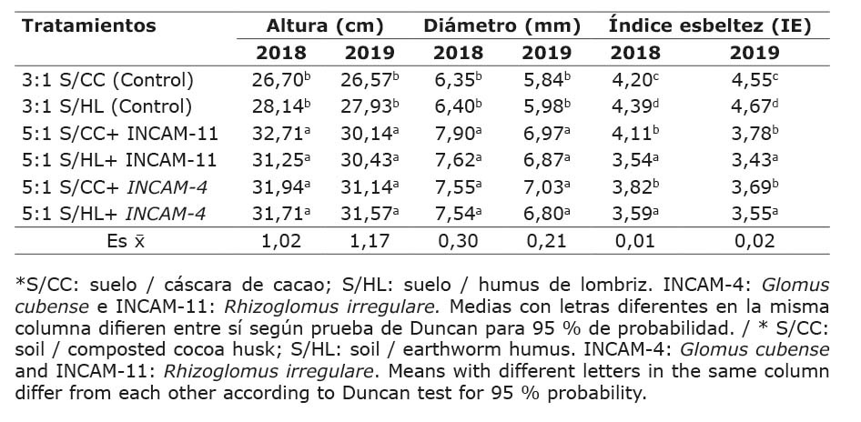 Al evaluar el índice de esbeltez (relación altura/diámetro) los mejores valores se encontraron en los tratamientos donde se inocularon G. cubense (INCAM-4) y R. irregulare (INCAM-11), los cuales superaron estadísticamente (p<0,05) a los testigos; así, con la cepa INCAM-11 se alcanzó un promedio para los dos años de 3,71 y con INCAM-4 fue de 3,61, mientras que con 3:1 suelo / cáscara de cacao estuvo en 4,37 y con 3:1 suelo: humus de lombriz fue de 4,53; es de señalar que este indicador mientras menor valor presente será un indicador de mayor vigor y calidad de las plántulas.