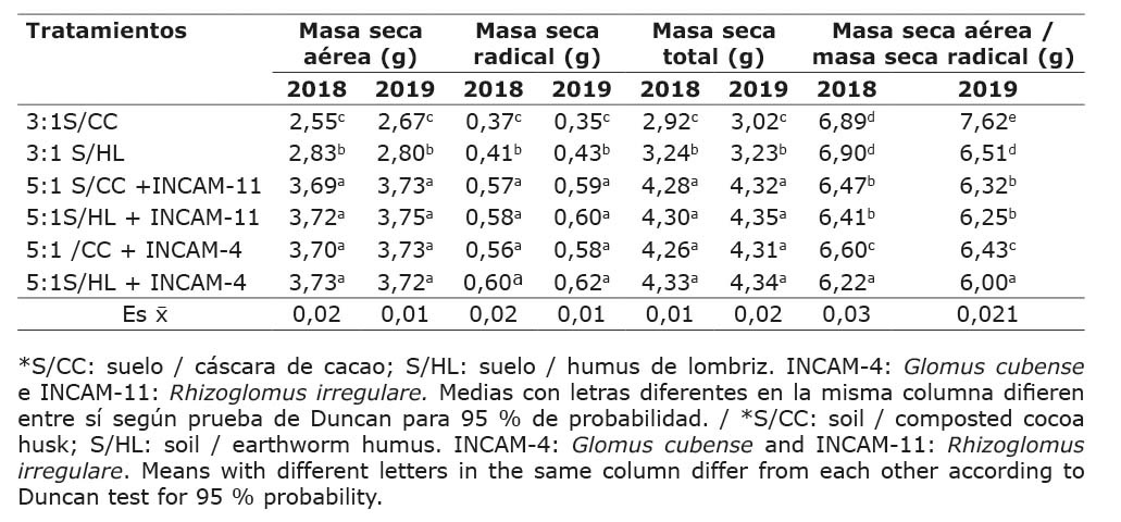 Para la masa seca total, se encontraron incrementos significativos similares como el alcanzado en sus componentes (masa seca aérea y masa seca radical). La inoculación con Rhizoglomus irregulare y Glomus cubense durante los dos años evaluados, permitió incrementos de la masa seca total promedio de 39 % en relación con los tratamientos controles.