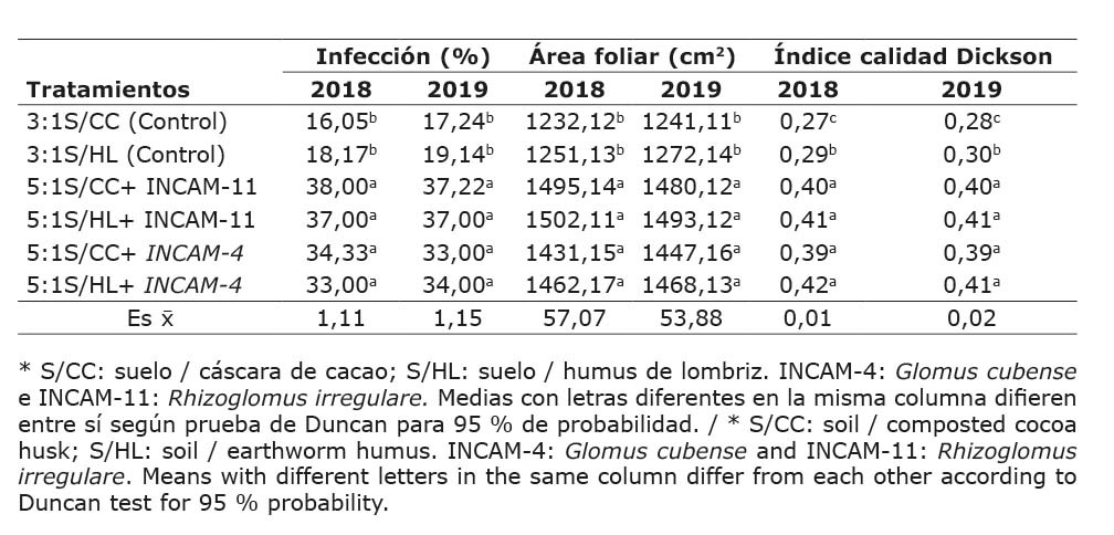 Table 5. Effect of the inoculation of substrate AMF strains (G. cubense y R. irregulare) on mycorrhizal colonization (%), leaf area (cm2) and the Quality Index Dickson in cocoa (Theobroma cacao) micro-grafts, in the nursery of the Paso de Cuba Management Center, Baracoa, Cuba. 2018 – 2019.