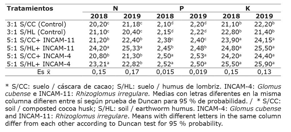 Estudios realizados en Colombia y Brasil, establecieron como adecuados los rangos para el nitrógeno de 18 – 25 g kg-1 y para el fósforo de 1,5 – 2,5 g kg-1, a nivel foliar (Góes de Oliveira et al., 2019; Marrocos et al., 2020; Puentes-Páramo et al., 2016). Estos valores fueron similares a los obtenidos en las posturas de cacao inoculadas con HMA con un sustrato 5:1 con cáscara de cacao o humus de lombriz, lo que sugiere que dichas plantas tienen una adecuada concentración de nutrientes foliares, a partir de los criterios de esos autores. La cantidad de N, P y K, sustenta la efectividad de Glomus cubense y Rhizoglomus irregulare con esos niveles de abono orgánico (5:1) para las posturas de cacao en un suelo Cambisol éutrico, al provocar una mayor asimilación de nutrientes por parte de las plantas micorrizadas y por lo tanto, mayor crecimiento, debido a que los HMA incrementan el volumen de suelo a explorar por las raíces a través de una red de hifas interconectadas, que favorece el aumento de la absorción de agua y elementos minerales presentes en el suelo, como los de difusión limitada como el P (Klabi et al., 2014). Por lo que, un funcionamiento micorrízico efectivo incrementa la absorción de los nutrientes del suelo (Medina & Azcon, 2010; Simó González et al., 2017).