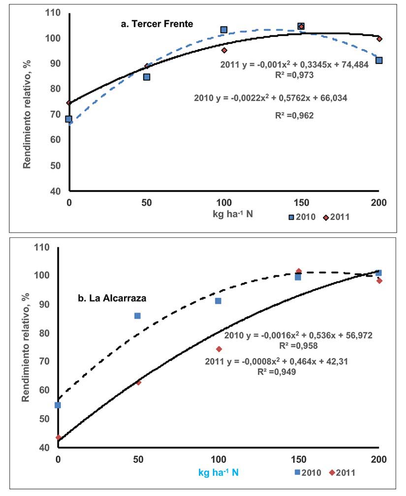 Figure 1. Relationship between N doses and relative yield in C. canephora. Tercer Frente, province of Santiago de Cuba and La Alcarraza, Sagua de Tánamo, province of Holguín, Cuba. 2010 (a) and 2011 (b).