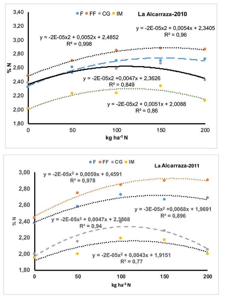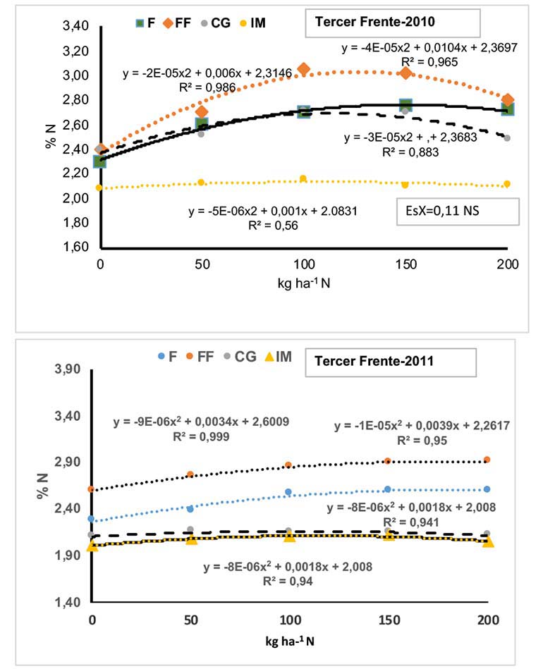 Las dosis de fertilizante nitrogenado y los tenores foliares correspondientes mostraron relaciones con coeficientes de determinación altos, sobre todo en los muestreos de inicio de fructificación y floración (Figura 2 y 3). Las concentraciones de nitrógeno mayores se encontraron en el muestreo de inicio de fructificación en ambas localidades y asociadas a la dosis óptima encontrada en cada año.