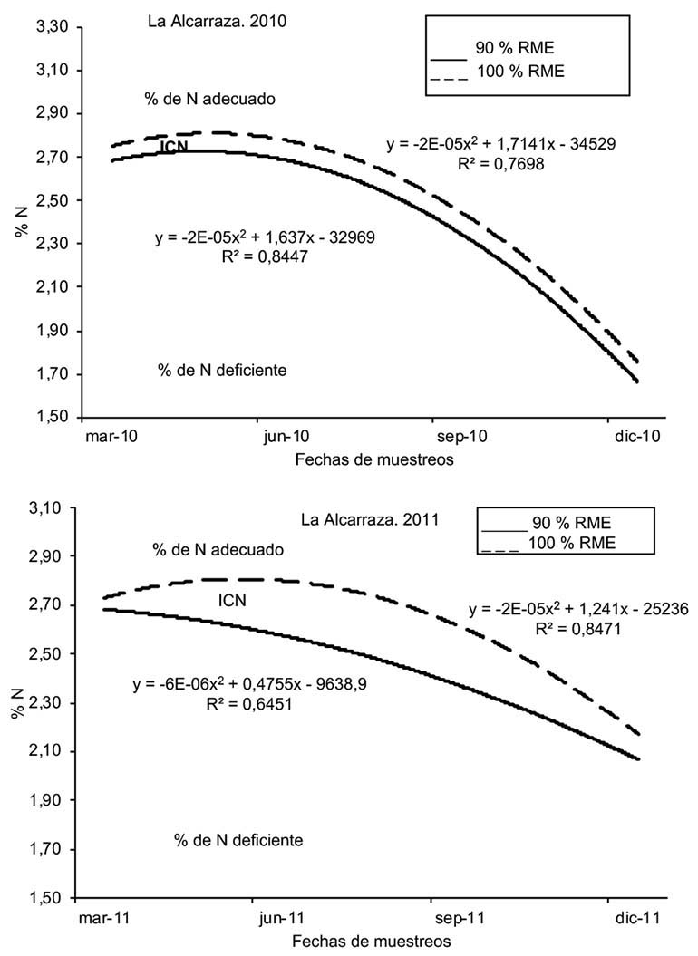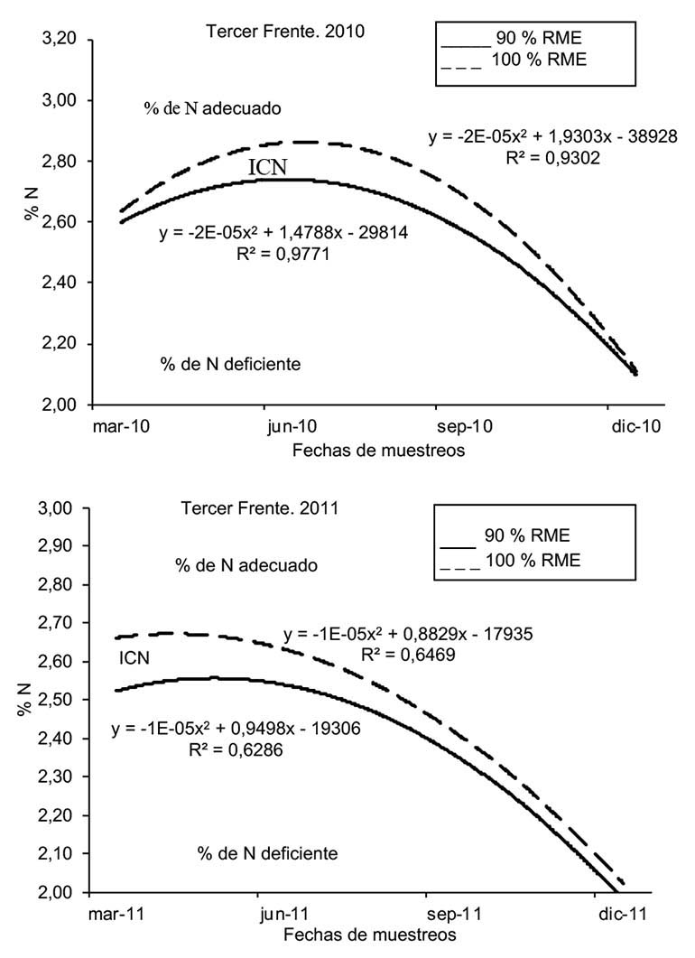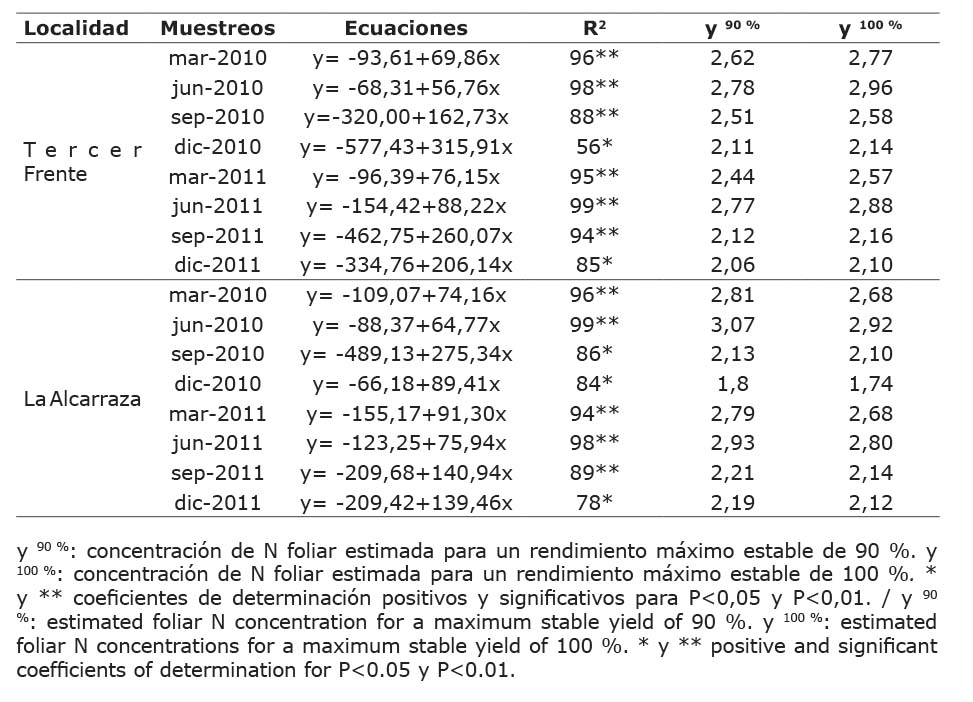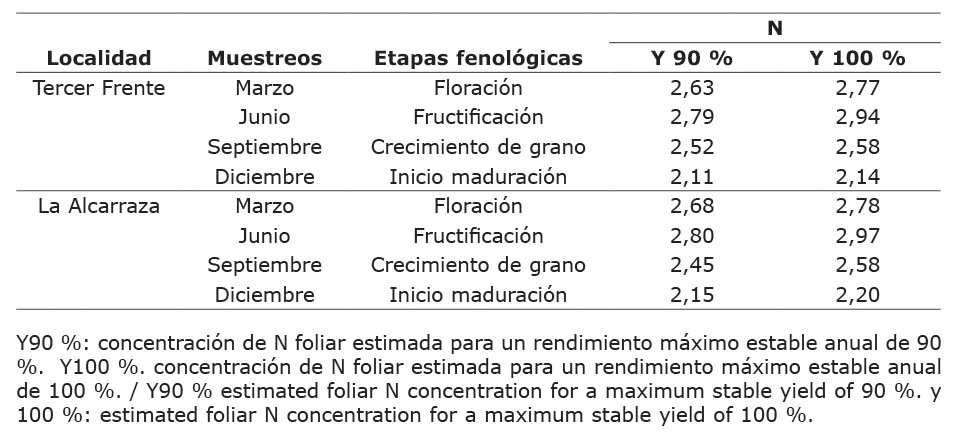 Se consideraron como valores adecuados del porcentaje de N foliar, aquellos que garantizaron más del 90 % del rendimiento máximo estable anual (RME) y una zona donde se presentan rendimientos entre 90 % y 100 % del RME considerada crítica, que constituye una zona dudosa en la que no se justifica la necesidad de incrementos en el sistema de fertilización empleado (Hernández et al., 2009; Roberts & Dow, 1982). Como valores bajos o indicativos de un sistema de fertilización insuficiente, se tuvieron aquellos que garantizaron rendimientos por debajo de 89 % del RME.