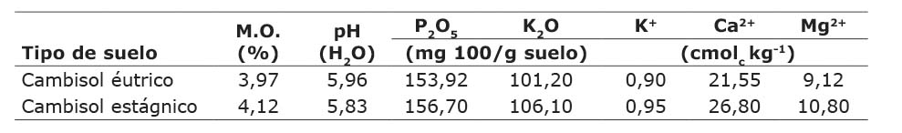 En los sitios experimentales se hicieron perfiles de suelo al inicio de los experimentos y se determinaron algunas características químicas (Cuadro 1). Los suelos se clasificaron como Cambisol éutrico (Food and Agriculture Organization of the United Nations [FAO], 2015) y Cambisol estágnico éutrico (FAO, 2015).