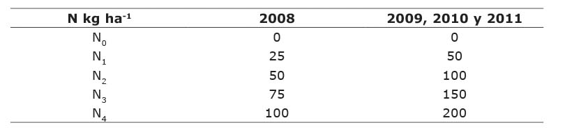 Se estudió la respuesta de cinco dosis de fertilización nitrogenada (Cuadro 2) y fondo de fósforo (50 kg ha-1) y potasio (160 kg ha-1), en un diseño experimental de bloques al azar con cuatro réplicas. Las parcelas fueron constituidas por siete plantas, se muestrearon las cinco plantas centrales, para un total de veinte plantas por tratamiento (0,54 ha).