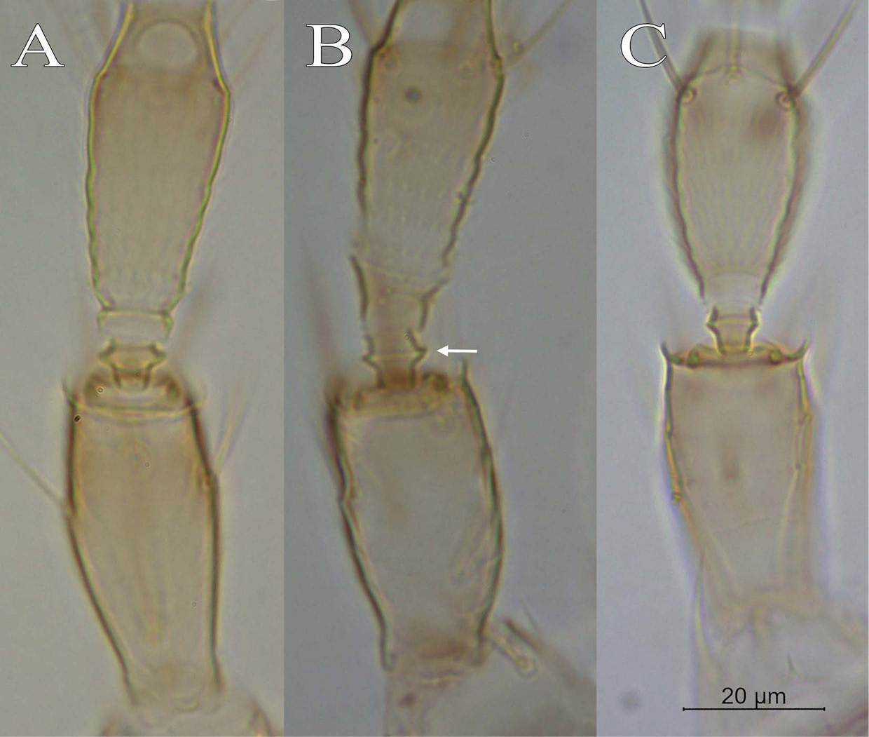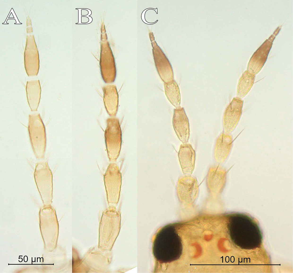 Figure 6. Antennal segments. A, Frankliniella invasor. B, Frankliniella gardeniae. C, Frankliniella rostrata. A and B with same bar scale. CIEMic-University of Costa Rica, San José, Costa Rica, 2020.