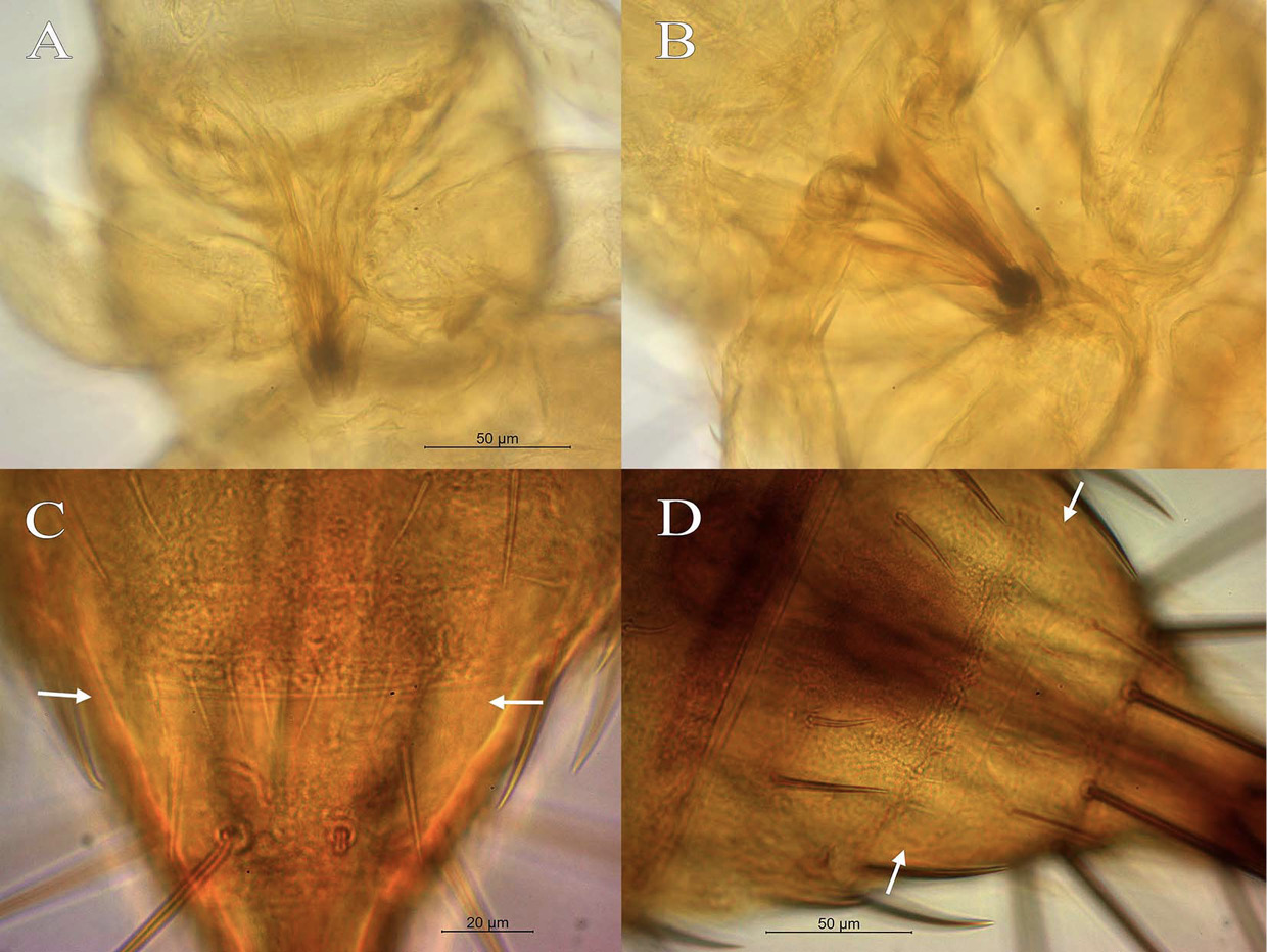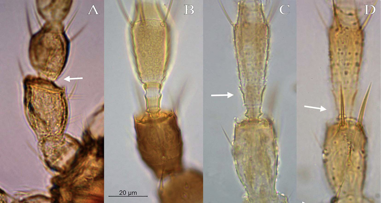 Retana-Salazar & González-Herrera (2011), Retana-Salazar et al. (2010)Figure 1. Antennal segments III. A, Frankliniella grandecuriosa modified at the anteroventral edge, with backward projection. B, Frankliniella parvula. C, collar modified in the shape of an inverted bell. D, strong setae in second antennal segment. Same bar scale for entire image. Centro de Investigación en Estructuras Microscópicas, Universidad de Costa Rica, San José, Costa Rica, 2020.