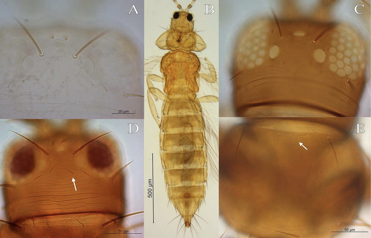 Figure 8. A, ocellar setae III arising inside the ocellar triangle in Frankliniella difficilis. B, Frankliniella occidentalis -most common variant- with color pattern on abdomen. C, ocellar setae III arising outside the ocellar triangle in Frankliniella insularis. D, postocular setae I in Frankliniella panamensis. E, anteromarginal setae short in Frankliniella fallaciosa. C and E with same bar scale. Centro de Investigación en Estructuras Microscópicas, Universidad de Costa Rica, San José, Costa Rica, 2020.