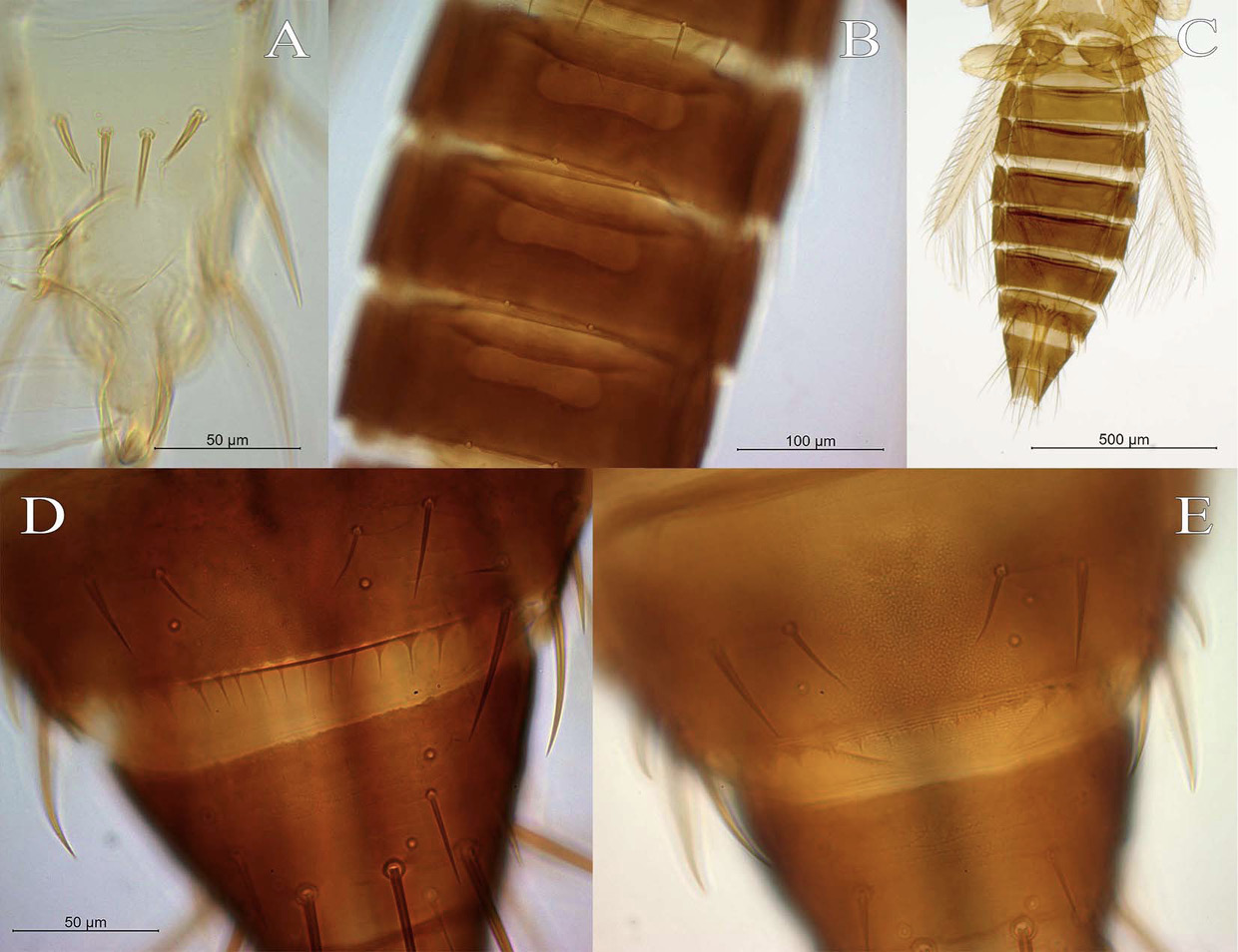 Figure 9. A, males setae B1 and B2 of tergite IX in Frankliniella gardeniae. B, males sternal plates -glandular sternal areas- in Frankliniella insularis. C, bicolor abdomen in Frankliniella nigricauda: pale brown on first tergites to dark brown last tergites. D and E, comb on the posterior margin of tergite VIIl of the abdomen in Frankliniella panamensis (D) and Frankliniella fallaciosa (E). D and E with same bar scale. Centro de Investigación en Estructuras Microscópicas, Universidad de Costa Rica, San José, Costa Rica, 2020.