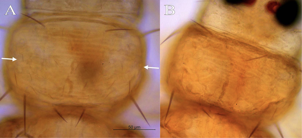 Figure 2. A, Frankliniella grandecuriosa with median row of setae. B, Frankliniella albacuriosa. A and B with same bar scale. Centro de Investigación en Estructuras Microscópicas, Universidad de Costa Rica, San José, Costa Rica, 2020.
