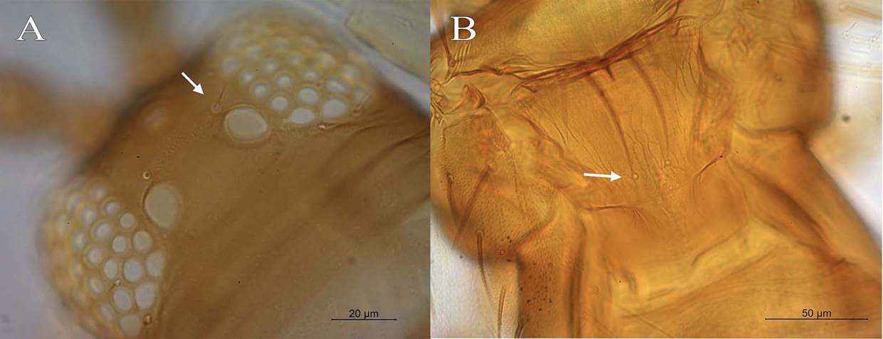4b) Sedas interocelares ubicados en el margen anterior interno de los ocelos posteriores, estas son mayores a 5 µm de longitud; sensilias del metanoto presentes (Figura 3B); sedas anteroangulares relativamente desarrolladas; tibias I de color amarillo claro y fémur I sombreado con café; cuerpo de macho de color amarillo ..................................................bagnalliana.