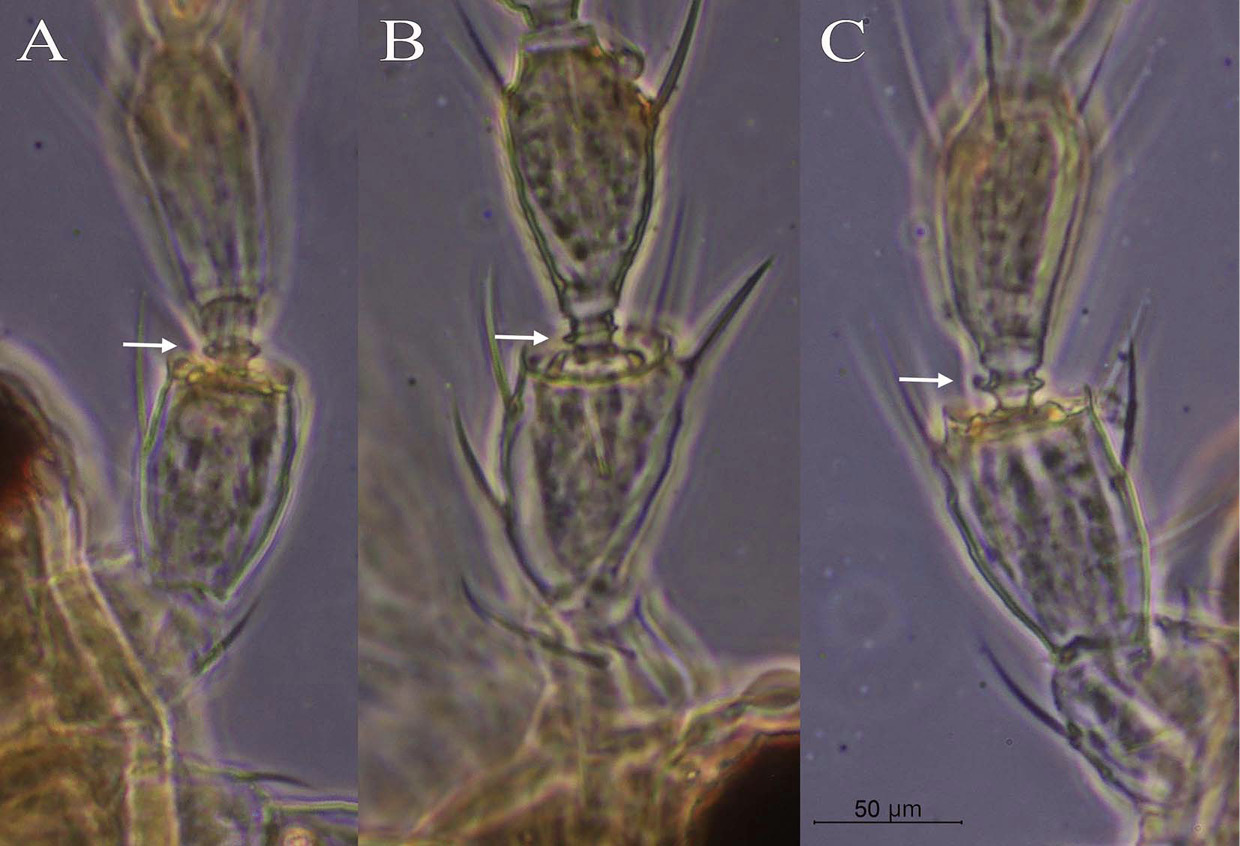 Figure 5. A, antennal segment II elongated. B, Frankliniella cephalica, with notorious basal ring in pedicel of antennae segment III. C, pedicel of antennae segment III in Frankliniella difficilis. Same bar scale for entire image. Centro de Investigación en Estructuras Microscópicas, Universidad de Costa Rica, San José, Costa Rica, 2020.
