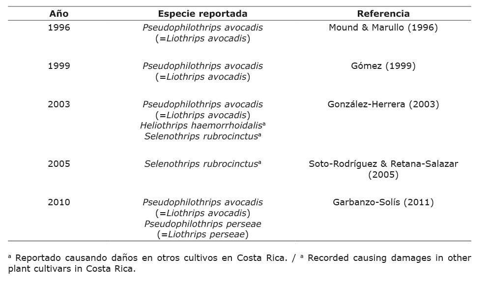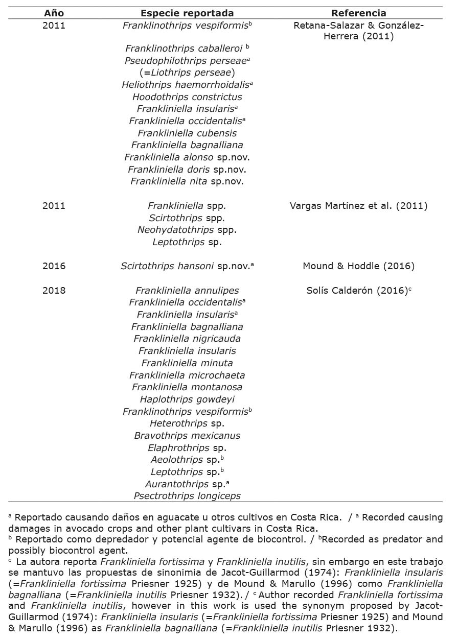 A nivel mundial, es conocida una amplia biodiversidad de especies de trips como plagas de cultivos (Cluever & Smith, 2017). En árboles de Persea americana Mill. (aguacate) de Costa Rica solo se presentaron reportes de especies directamente asociadas a estos, sin el registro de daños debido a fitofagia (González-Herrera, 2003). En total, fueron veintinueve especies de trips oficialmente reportadas como asociadas con el cultivo, sin determinar cuáles se trataban exactamente de visitadores esporádicos en el árbol. De ellas, trece especies pertenecían al género Frankliniella, pero con una distribución y frecuencia variable, así como fueron reportadas en otros países (Ascención-Betanzos et al., 1999; Urías et al., 2007).