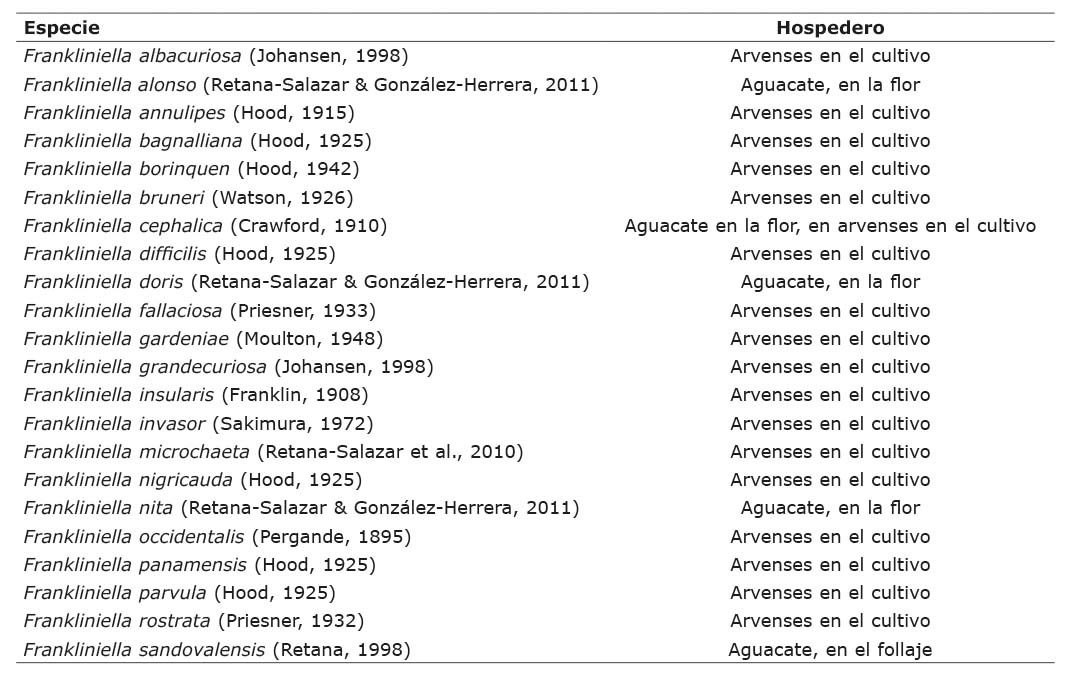 Retana-Salazar & González-Herrera (2011), Retana-Salazar et al. (2010)Ninguna de las especies recolectadas en el presente estudio reportó datos técnicos que demuestre una incidencia como plagas del aguacate dentro o fuera de Costa Rica. Sin embargo, F. occidentalis y F. insularis, han sido conocidas a nivel mundial por su fitofagia en múltiples cultivos. De las veintidós especies de Frankliniella que estuvieron asociadas al cultivo del aguacate en Costa Rica, solo cinco fueron encontradas usando el árbol como hospedero. Cuatro especies estuvieron asociadas a la flor y solamente F. sandovalensis se registró en el follaje. La mayor parte de las especies (dieciocho en total) fueron recolectadas en las plantas arvenses asociadas al cultivo. La especie F. cephalica se registró simultáneamente en las flores del árbol de aguacate y en la floración de arvenses cercanas al cultivo.