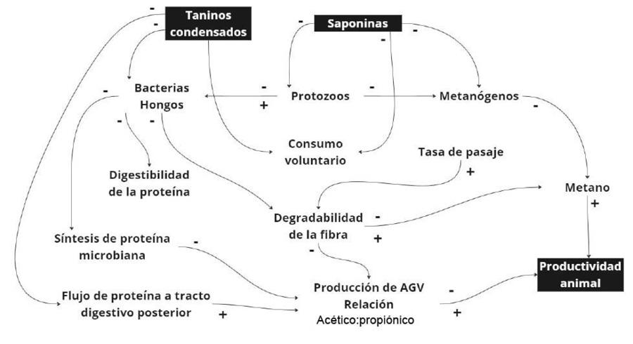 Estudios in vivo realizados por Molina-Botero et al. (2019), demostraron que la inclusión de vainas de Enterolobium cyclocarpum (Jacq.) Griseb. y forraje de G. sepium en un 15 y 30 % de la materia seca de la ración, disminuyó las emisiones anuales de metano por unidad de producto, sin afectar la ingesta diaria de materia seca. Al incluir el 4 % de taninos hidrolizables y taninos condensados en la dieta de corderos, no se afectó la población de bacterias y hongos ruminales (Salami et al., 2018). Sin embargo, los mismos autores reportaron que los taninos condensados redujeron de manera significativa la abundancia de microorganismos metanogénicos.