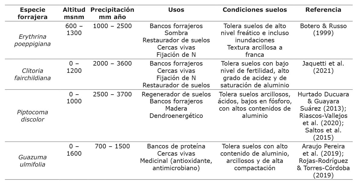 Las condiciones edafoclimáticas de la región amazónica, condicionan la actividad ganadera, se han observado precipitaciones de hasta los 3500 mm anuales, temperaturas superiores a los 30 °C y humedad relativa del 86 % (Instituto de Hidrología, Meteorología y Estudios Ambientales [IDEAM], 2018), no obstante, las plantas arbustivas y arbóreas surgen como una alternativa de producción con aceptables características de adaptación (Riascos-Vallejos et al., 2020). Es el caso de las especies forrajeras E. poeppigiana, C. fairchildiana, P. discolor y G. ulmifolia, las cuales se encuentran presentes en bosques de regeneración y secundarios en el piedemonte amazónico (Cuadro 1).