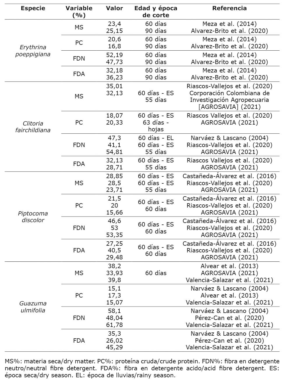 Table 2. Mean nutritional composition values reported by several authors for the selected species in tropical conditions. Colombia. 2022.