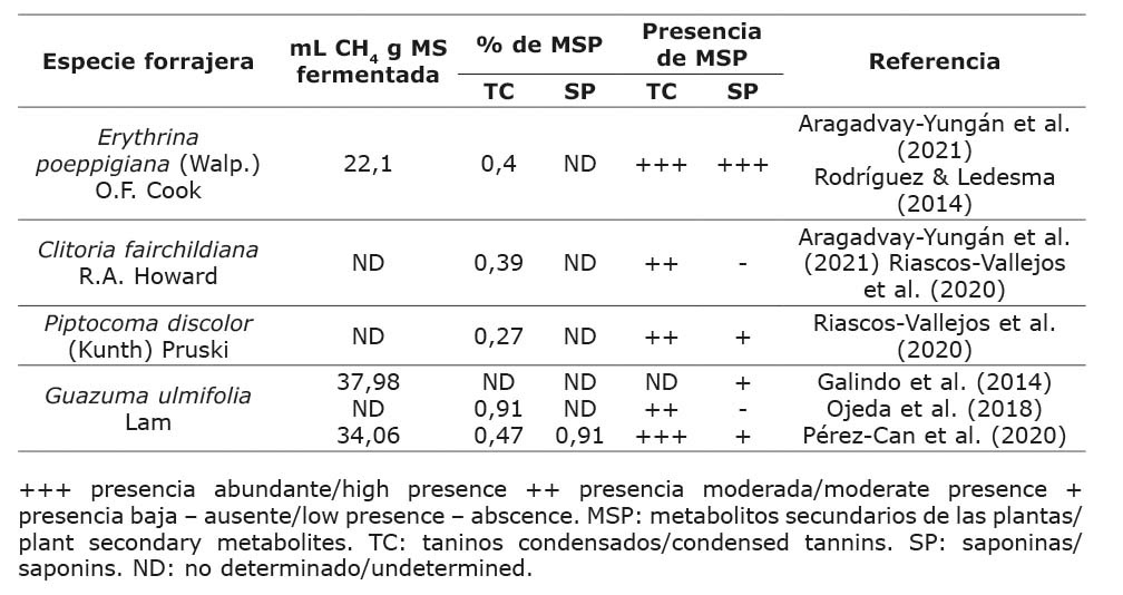 Aragadvay-Yungán et al. (2021), Rodríguez & Ledesma (2014), Riascos-Vallejos et al. (2020), Galindo et al. (2014), Ojeda et al. (2018), Pérez-Can et al. (2020)En C. arborea Benth., se ha identificado la presencia de taninos (1,3 % taninos condensados y 1,9 % fenoles totales) que demuestran una posible reducción en la producción de metano in vitro, atribuida a estos metabolitos (1,23 mL CH4 g MS 24 h) (Aragadvay-Yungán et al., 2021). Para P. discolor no se encontraron datos en la literatura sobre su efecto en la reducción de CH4; no obstante, se ha demostrado que posee un contenido de proteína adecuado para la nutrición de rumiantes (Riascos-Vallejos et al., 2020).