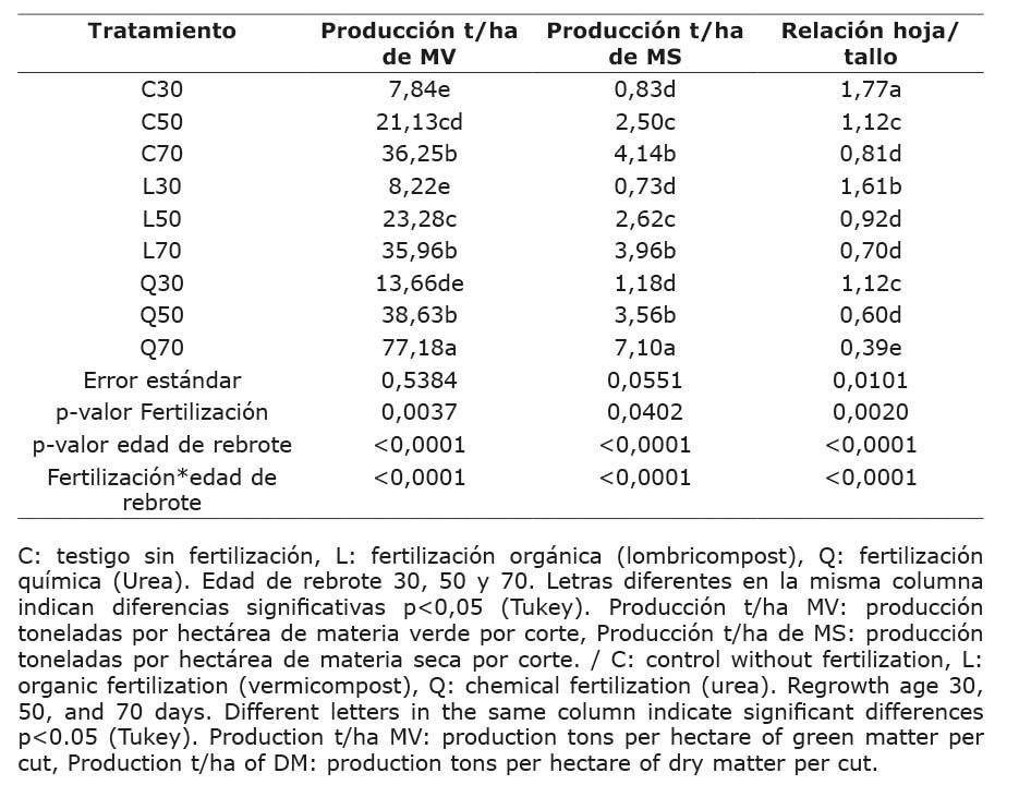 Se observó como el rendimiento productivo se relacionó con la edad de rebrote y el tipo de fertilización, donde al incrementarse la edad de rebrote se dio una mayor absorción y aprovechamiento del nitrógeno aportado por el fertilizante químico, por lo que se alcanzaron mayores rendimientos de forraje y aumentaron los contenidos de proteína cruda.