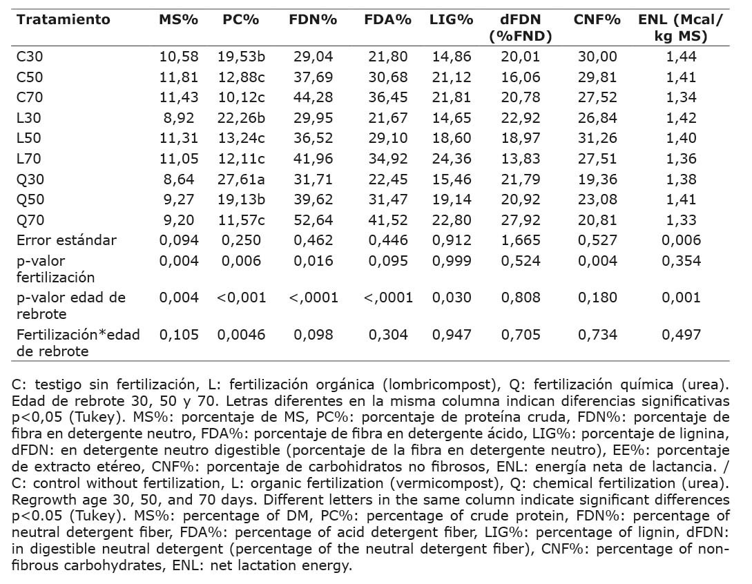 Los valores más altos de PC% se encontraron en el tratamiento Q30 con un valor de 27,61 %, este fue estadísticamente superior a los demás tratamientos evaluados. Los valores más bajos se obtuvieron en C70 (10,12 %). La FDN% presentó un efecto significativo para las variables de fertilización (p=0,0157) y edad de rebrote (p<0,0001) (Cuadro 3). Los contenidos más bajos de FDN se encontraron en plantas fertilizadas con lombricompost y en plantas sin fertilización con 36,14 % y 37 % de FDN, respectivamente, fueron significativamente inferiores a los obtenidos con la fertilización química (41,32 %). El FDN% más bajo se encontró en la edad de rebrote de 30 días (30,23 %), este valor fue significativamente diferente a los de las edades de 50 (37,94 %) y 70 días (46,29 %).