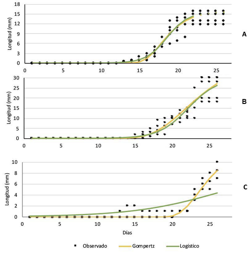 La longitud de la raíz se considera un buen estimador del crecimiento y desarrollo para las tres accesiones seleccionadas por el potencial de enraizamiento a los veintiséis días. En la accesión 15010099, el análisis de crecimiento con el modelo logístico estimó una tasa de crecimiento (TC) de 0,74 mm/día en relación al valor de crecimiento máximo alcanzado (15,4 mm) lo que ratificó el potencial de enraizamiento alto observado, esto por la acumulación temprana de biomasa antes de los quince días (Figura 3A). La accesión 15010097 mostró un desarrollo acelerado de la raíz a partir de los quince días con TC de 0,51 mm/día con una elongación máxima de raíces de 29,8 mm (Figura 3B). La accesión 15010007 presentó una TC de 0,39 mm/día y crecimiento máximo observado de 12,3 mm con el modelo de Gompertz a partir de los veinte días, lo que indica crecimiento lento de la raíz y se cataloga con potencial de enraizamiento bajo (Figura 3C).