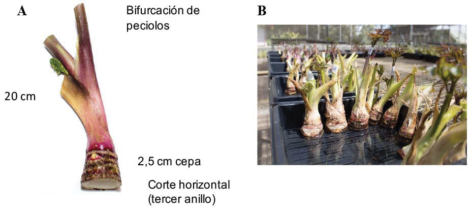 Los propágulos se acondicionaron mediante el corte del peciolo con 20 cm de longitud, dimensión que se tomó desde la bifurcación de los peciolos hasta la unión del peciolo con la cepa (tercer anillo, 2,5 cm aproximadamente) con un corte horizontal (Figura 1A), el tejido meristemático expuesto dio origen al sistema radicular. El material de propagación se sometió a procesos de lavado con agua potable y desinfección en una solución a base de dióxido de cloro (ClO2) en una dosis de 2 cc L-1 de agua, mantenidos en inmersión por 15 min. Para la evaluación de enraizamiento de los propágulos se utilizó agua tratada con ClO2 en dosis de 0,2 cc L-1 de agua, agregada en bandejas hasta un nivel máximo de 1 cm de altura hasta cubrir la base del propágulo (Figura 1B).