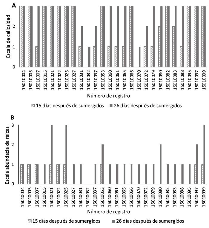 Durante los primeros cinco días después de sumergidos (dds) no se presentó formación de callosidad (nula) en ninguna de las accesiones, a partir del sexto día once accesiones iniciaron con baja callosidad, incluido el testigo. A los 15 dds, trece accesiones además del testigo presentaron alta callosidad, y ello indica precocidad en la fase de diferenciación del tejido radicular, dos accesiones mostraron callosidad moderada (media) y en nueve accesiones se observó escasa formación de callosidad (baja). Al final de los veintiséis días, las accesiones 15010032 y 15010070 no sobrepasaron la escala baja de callosidad debido a que el desarrollo del tejido calloso fue tardío (Figura 2A).