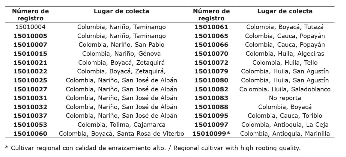 Se evaluaron veintiséis accesiones identificadas con el número de registro y su lugar de colecta (Cuadro 1), el criterio de selección fue la calidad de enraizamiento, se priorizaron las que mostraron limitado desarrollo de raíces en los últimos cinco años, según registros del curador. Como testigo se utilizó el cultivar regional denominado “Blanca Salamineña” cuyo potencial de enraizamiento es alto.