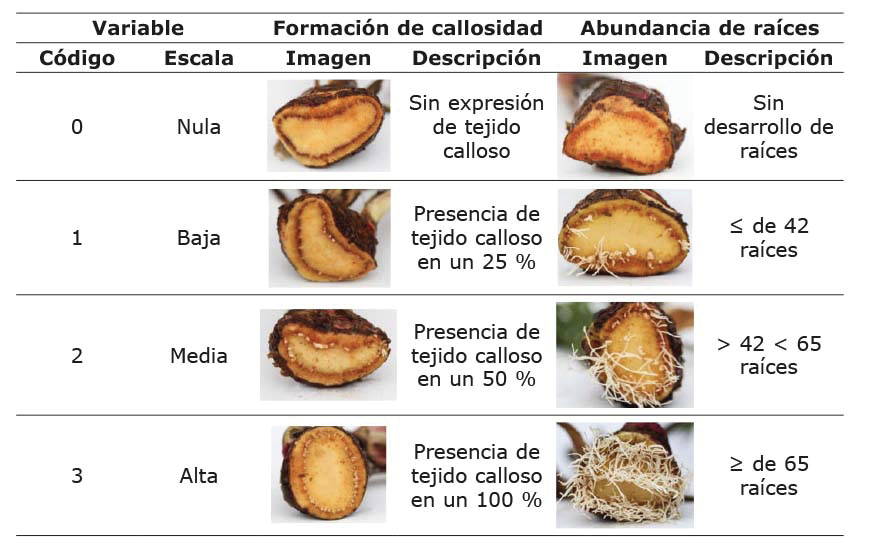 La formación de callosidad y enraizamiento en propágulos de arracacha de forma endógena mediante el uso de agua como medio enraizante y la evaluación de variables como la formación de callosidad y el número y la longitud de las raíces, permitió generar cuatro escalas de significancia: nula (0), baja (1), media (2) y alta (3), según se observó en el Cuadro 4, con desarrollo de callosidad a partir de los 12 días en un periodo no superior a 30 días, las cuales categorizaron el potencial de enraizamiento por atributos relacionados con la emergencia, la abundancia y el tamaño de raíces. Escalas similares fueron utilizadas por Matos et al. (2015) en trabajos con micropropagación de ápices caulinares de arracacha bajo un mecanismo exógeno estimulado por reguladores de crecimiento en dos diferentes medios de cultivos, donde se definieron tres escalas: sin callo (1), callo leve (2) y callo moderado (3), con incidencia de callosidad a partir de los quince días. Sin embargo, Slíva et al. (2010) al utilizar peciolos de arracacha enraizados en medios de cultivo de tejidos sin reguladores del crecimiento, obtuvieron brotes nuevos por explante a partir de la cuarta semana.