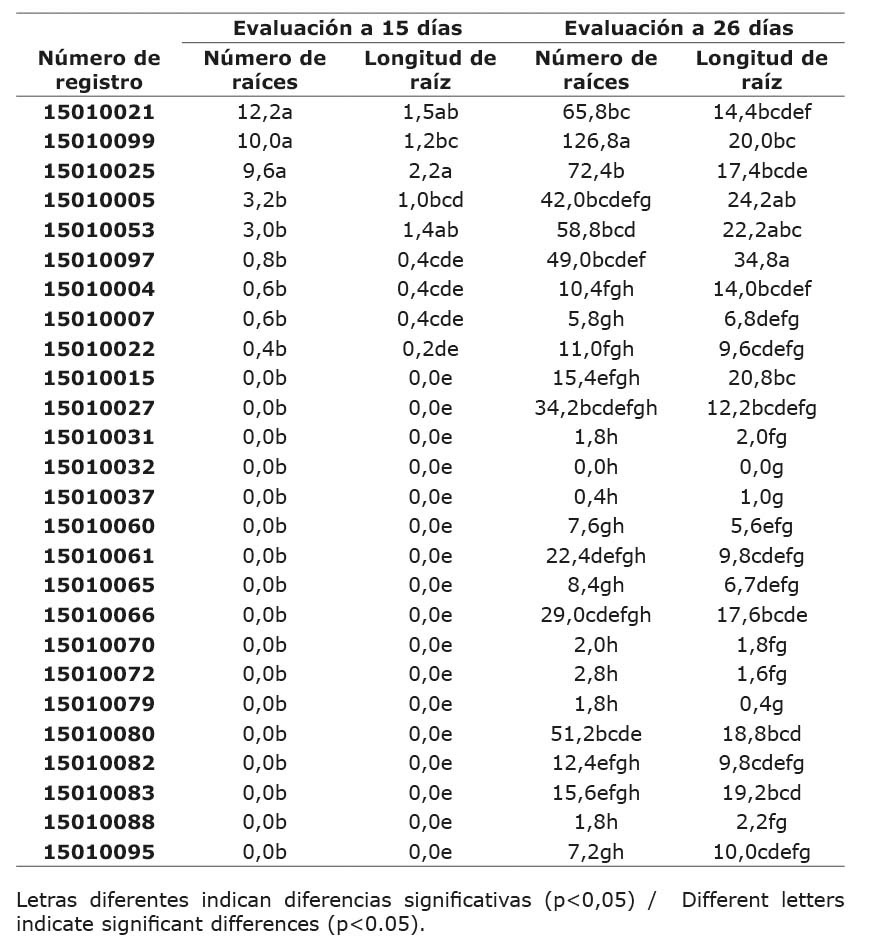 De las veintiséis accesiones evaluadas, diecinueve expresaron un bajo potencial de enraizamiento, con menos de 42 raíces, debido al poco desarrollo de estas a los veintiséis días de evaluación. Las accesiones 15010053, 15010080 y 15010097 presentaron un potencial de enraizamiento medio, con 49, 51,2 y 58,8 raíces, respectivamente. El testigo 15010099 presentó precocidad en la emergencia de raíces desde los trece días con potencial de enraizamiento alto y 126 raíces al final de la evaluación, característica que también lo compartieron las accesiones 15010021 y 15010025 con 65,8 y 72,4 raíces. La accesión 150100032 fue la única que no desarrolló raíces en ninguna de las dos fechas evaluadas (Cuadro 3).