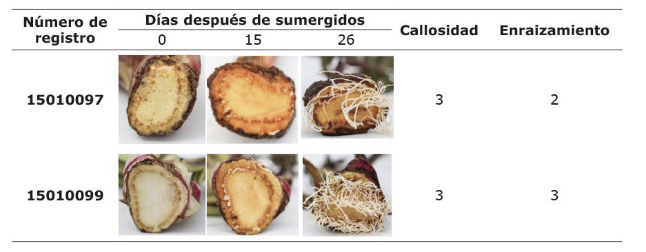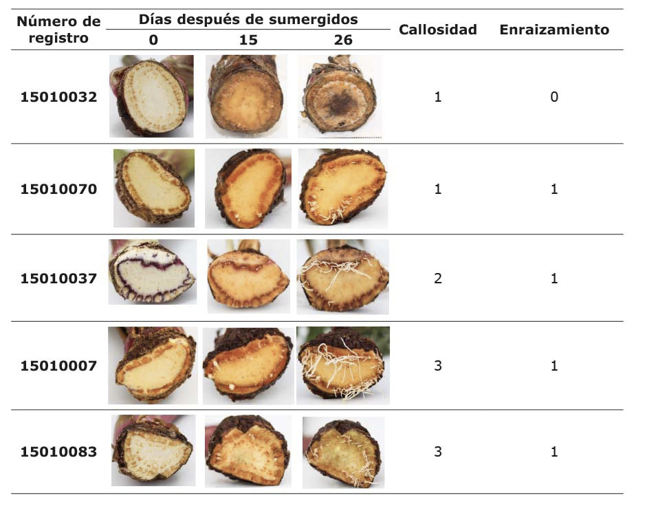 La evaluación cualitativa de formación de callosidad y abundancia de raíces entre los cero y veintiséis días identificó siete accesiones representativas. En el Cuadro 4 se muestran las accesiones con callosidad baja, media y alta, y enraizamiento nulo y bajo. Accesiones con callosidad alta y enraizamiento medio y alto se presentan en el Cuadro 5.