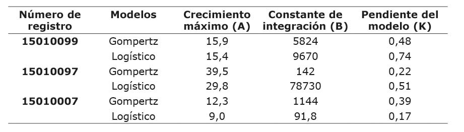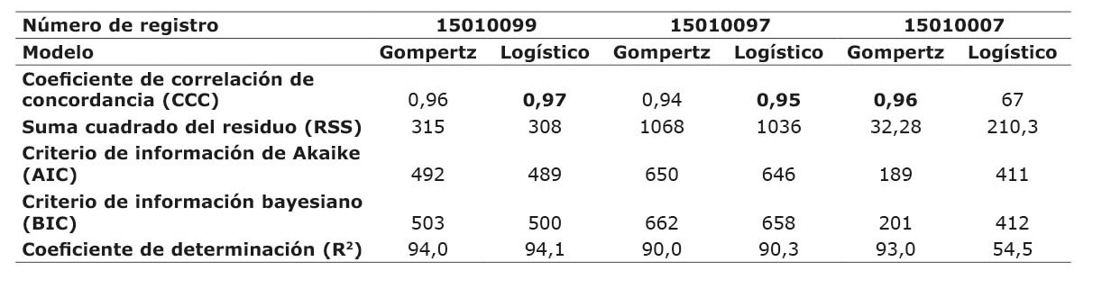 Con base en los criterios de ajuste en su conjunto, se encontró que el modelo logístico no se ajustó a los datos de la función de crecimiento de la accesión 15010007, ya que el valor del CCC (0,67) estuvo por debajo del límite considerado (CCC <0,9) Para las accesiones 15010099 y 15010097 con el modelo logístico los valores de CCC fueron de 0,97 y 0,95, respectivamente, lo que significa que este modelo presentó un grado de concordancia sustancial (CCC = 0,95 – 0,99). Consecuente con estos resultados, los valores de los parámetros de suma cuadrado del residuo (RSS), criterio de información Bayesiano (BIC) y criterio de información de Akaike (AIC), en el modelo logístico fueron inferiores al modelo de Gompertz, se espera que modelos con valores comparativos en estos criterios más bajos, se ajusten mejor a un conjunto de datos. El coeficiente de determinación (R2) para el modelo logístico estuvo entre 90,3 a 94,1 en las accesiones 15010097 y 15010097, en tanto que para la accesión 15010007 el mejor ajuste para todos los criterios mencionados se logró con el modelo de Gompertz (Cuadro 7).